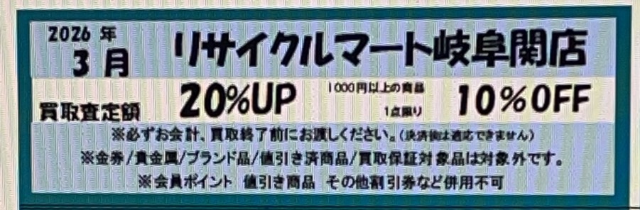 令和8年 2026年 3月クーポン リサイクルマート岐阜関店 新規お客様多数 当店舗、… <a href="https://www.recyclemart.jp/shop/gifuseki/info/1106226/" class="read-more">Read More</a>