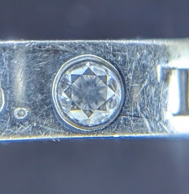 ジュエリーである今回のリングにおいては、「プラチナ部分の小傷や打痕」「ダイヤモンドの欠け(チッピング)や留め具の緩み」を専用のルーペで入念に確認いたします。