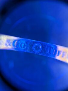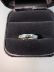 ジュエリーである今回のティファニーのリングには、バッグのような製造年数を示すシリアルはありませんが、ブランドロゴの刻印デザインや、素材を示す「Pt950(プラチナ純度95%)」の打刻をしっかりと確認します。