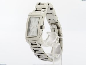 文字盤に大きく配置された「3」と「9」のアラビア数字が特徴的で、スタイリッシュなスクエアケースが手元を華やかに演出してくれる、女性に大変人気の高いモデルです。
