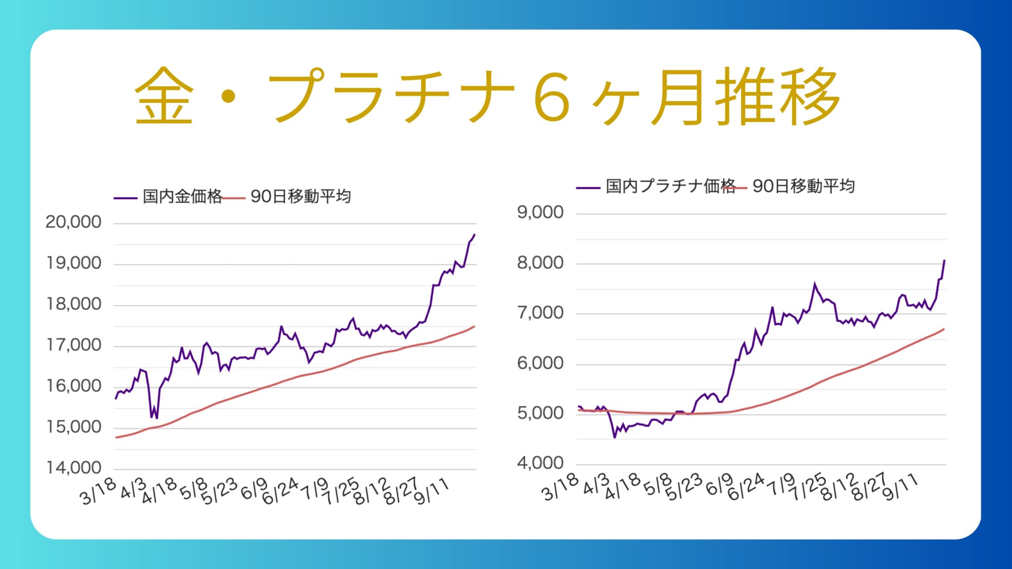 2025年9月現在、金は歴史的な高値圏にあり、プラチナも高い水準で推移しているため、売却を検討するには良いタイミングと言えます。ただし、売却の判断は個人の目的や状況によって異なるため、今後の価格動向に影響を与える要因を理解したうえで、慎重に決めることが重要です。