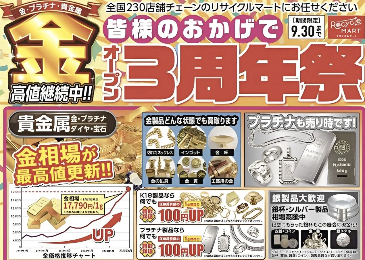 貴金属を売るなら「今」が好機です。3周年祭も開催しているのでぜひお気軽にご来店下さいませ👇️