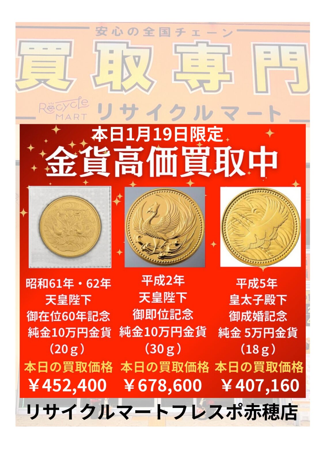 リサイクルマート フレスポ赤穂店では、各種記念金貨をただいま 高価買取実施中 です♬