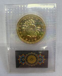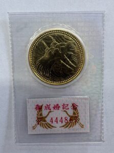 こちらの金貨は、現在の天皇陛下(当時の皇太子殿下)と雅子さまのご成婚を記念して発行されたものです。ブリスターパックに入った非常に綺麗な状態でお持ち込みいただきました。