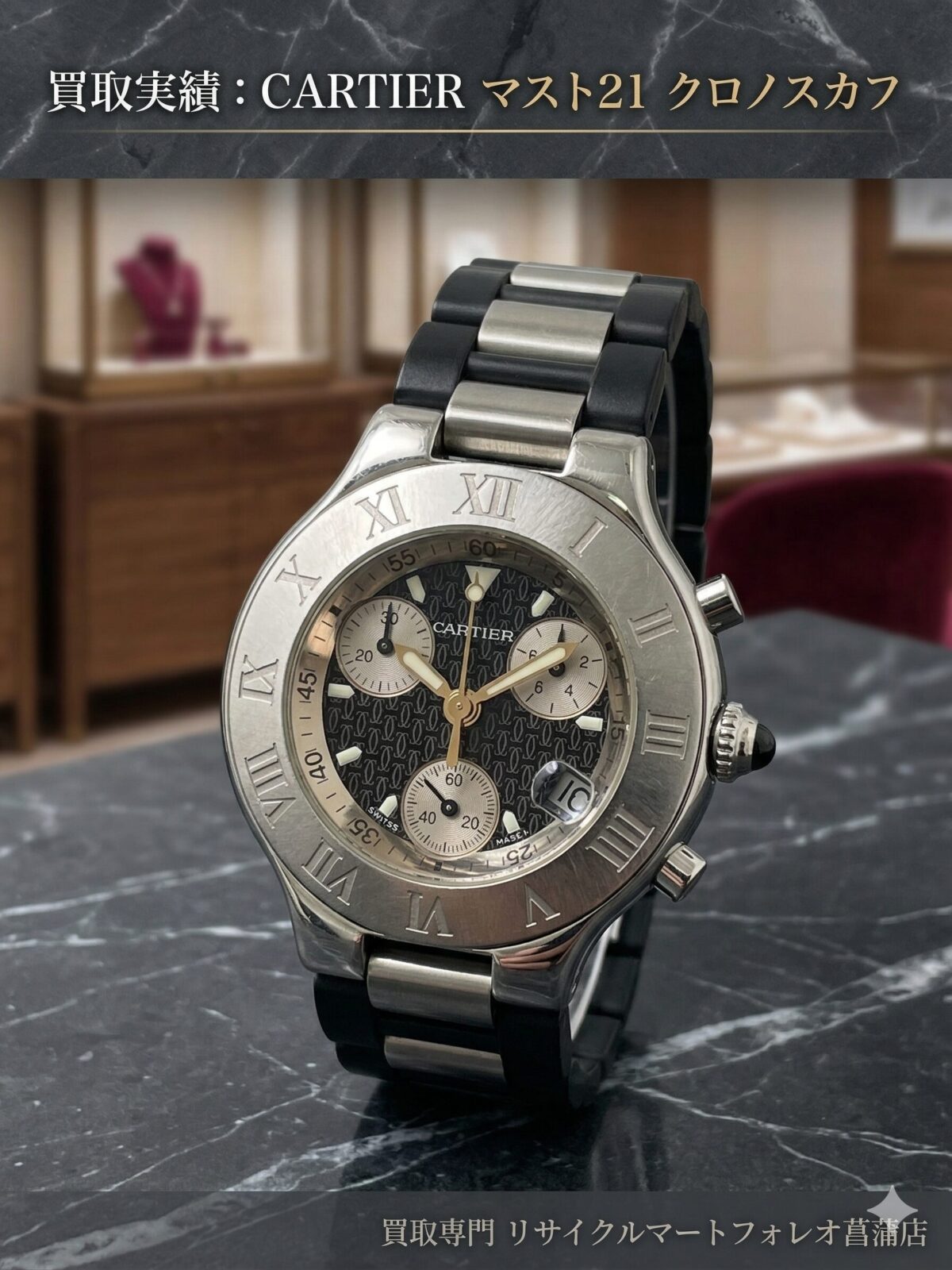 久喜・加須でカルティエ買取なら当店へ!スティール×ラバーの異素材使いが魅力の「マスト21 クロノスカ… <a href="https://www.recyclemart.jp/shop/shoubu/result/1103119/" class="read-more">Read More</a>
