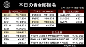 日々『本日の貴金属買取価格』の公表価格は変動するため、当HPや店頭入口の価格をチェックしてご来店くださいませ。