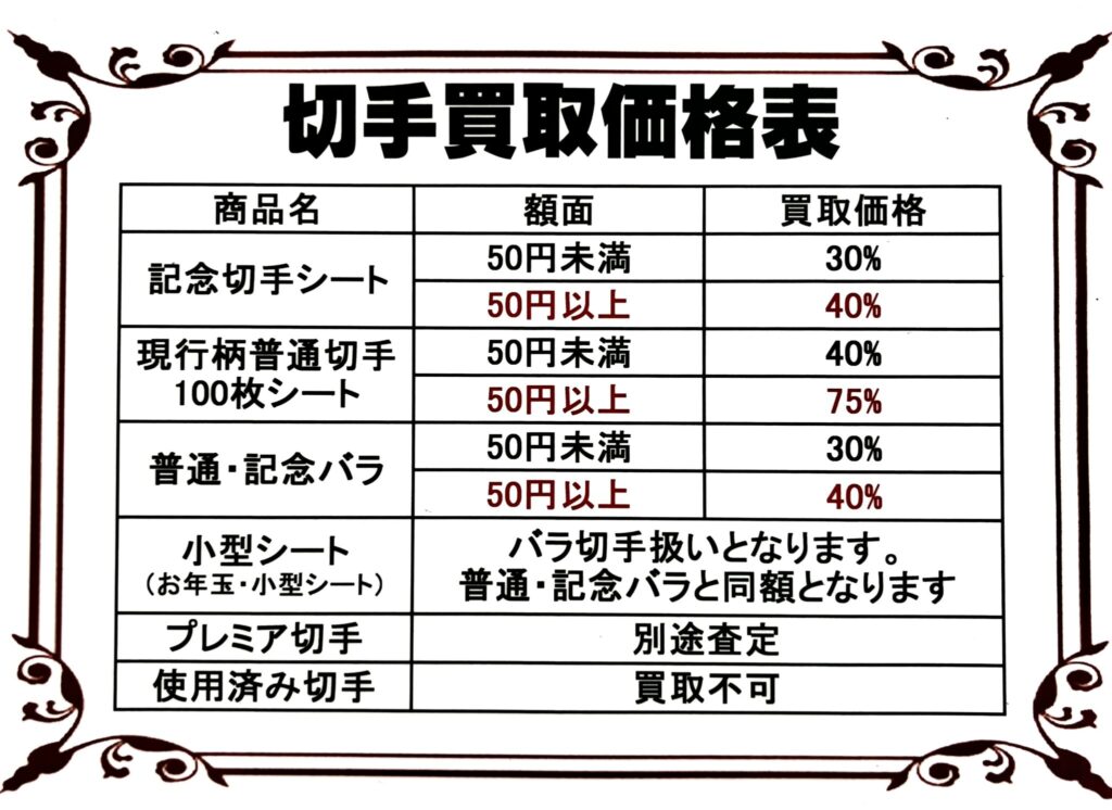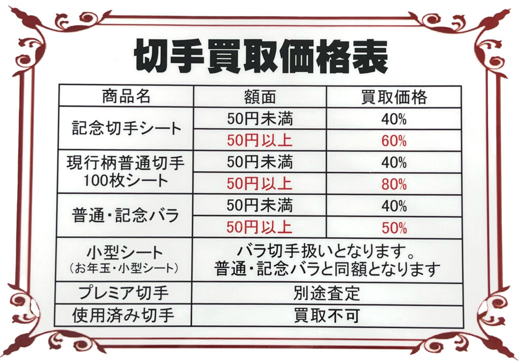 記念切手シート(10枚,20枚つづり)やバラ切手については、需要減少の波を大きく受けレートを下げる事となりました。2026年3月時点ではこちらの買取レートにてご案内を致しておりますが、今後も需要減少が進んだ場合さらにレートが下がってしまうかもしれません。