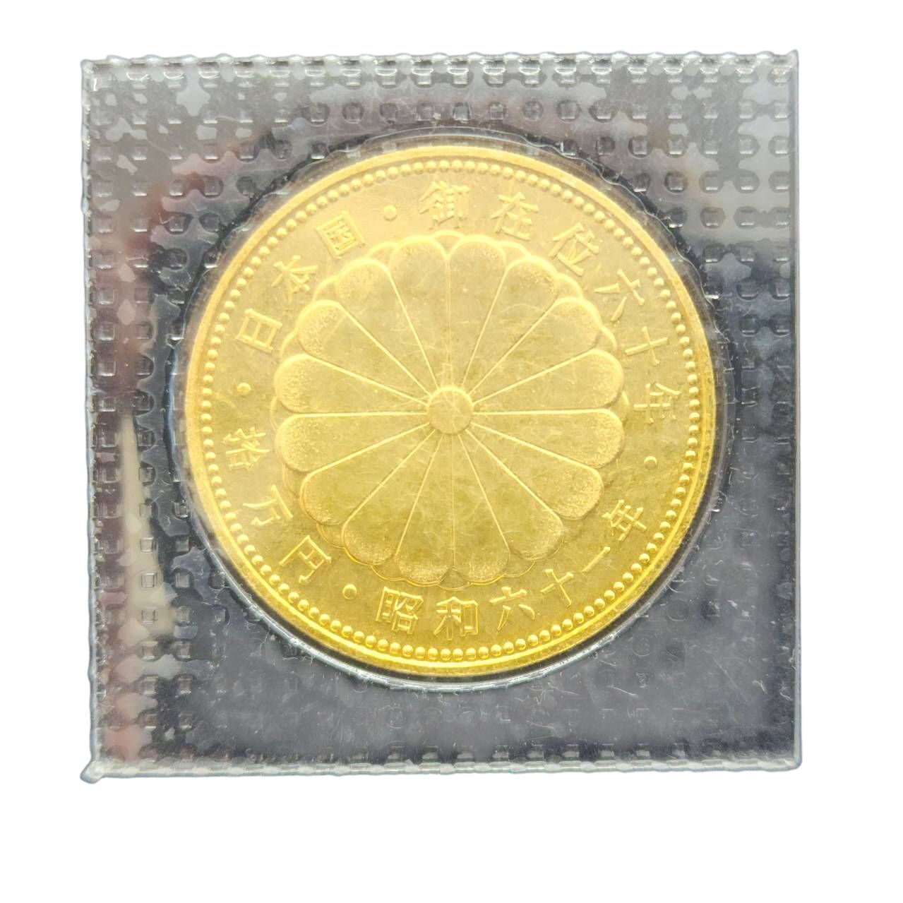 昭和天皇御在位60年(昭和61年・1986年)を記念して発行された純金製(K24)の金貨。額面10万円、重量約20g、品位は99.99%の純金です。発行枚数は限定で、保存状態が良いものはコレクター人気が高く、現在の市場価値は30万円前後〜金相場により変動します。高純度の金としての資産価値と、歴史的記念品としての希少価値を併せ持つ一枚です。