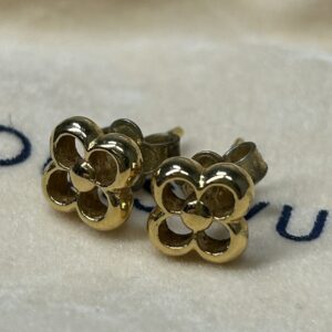 ゴールドトーンのメタル素材で作られており、ルイ・ヴィトンの象徴的なモノグラム・フラワーのモチーフをあしらったデザインです。耳元で上品で華やかな輝きを放っています。