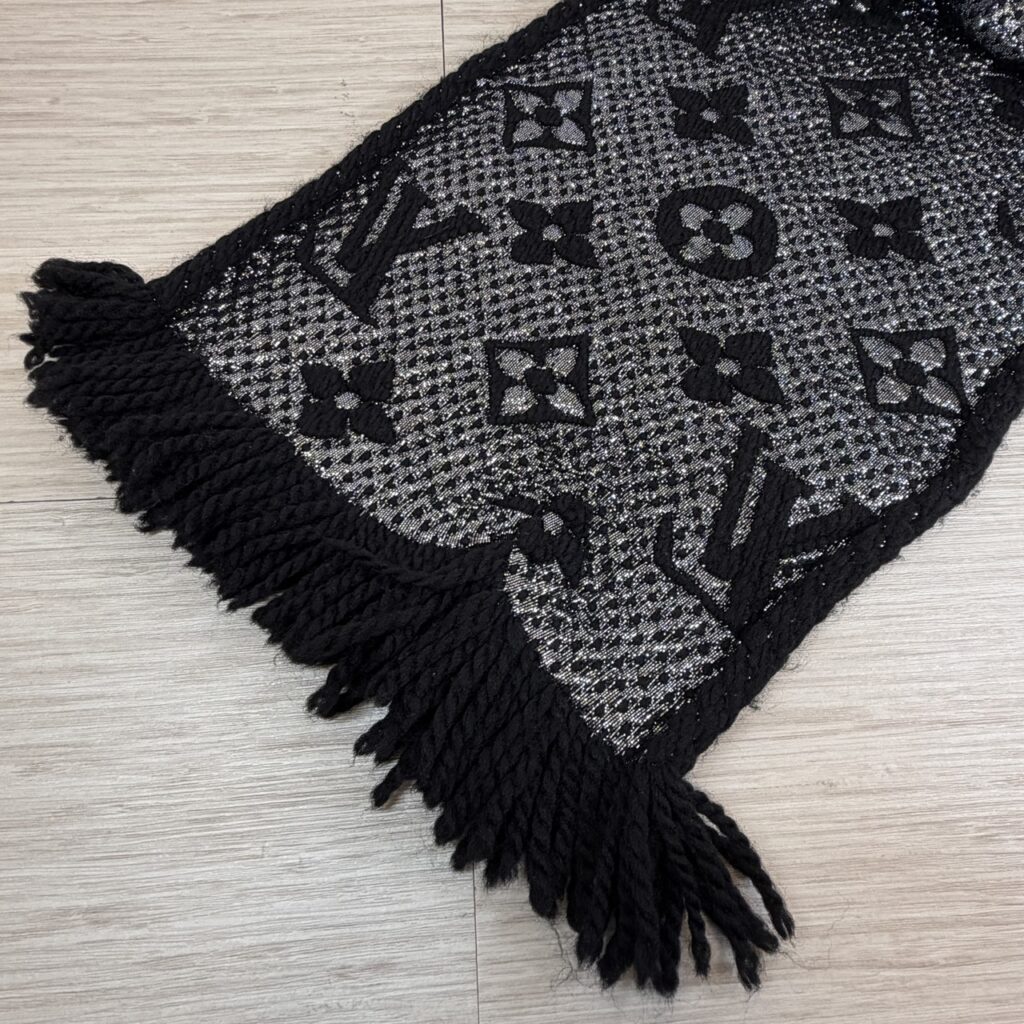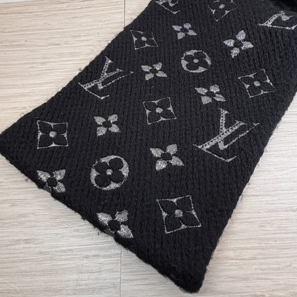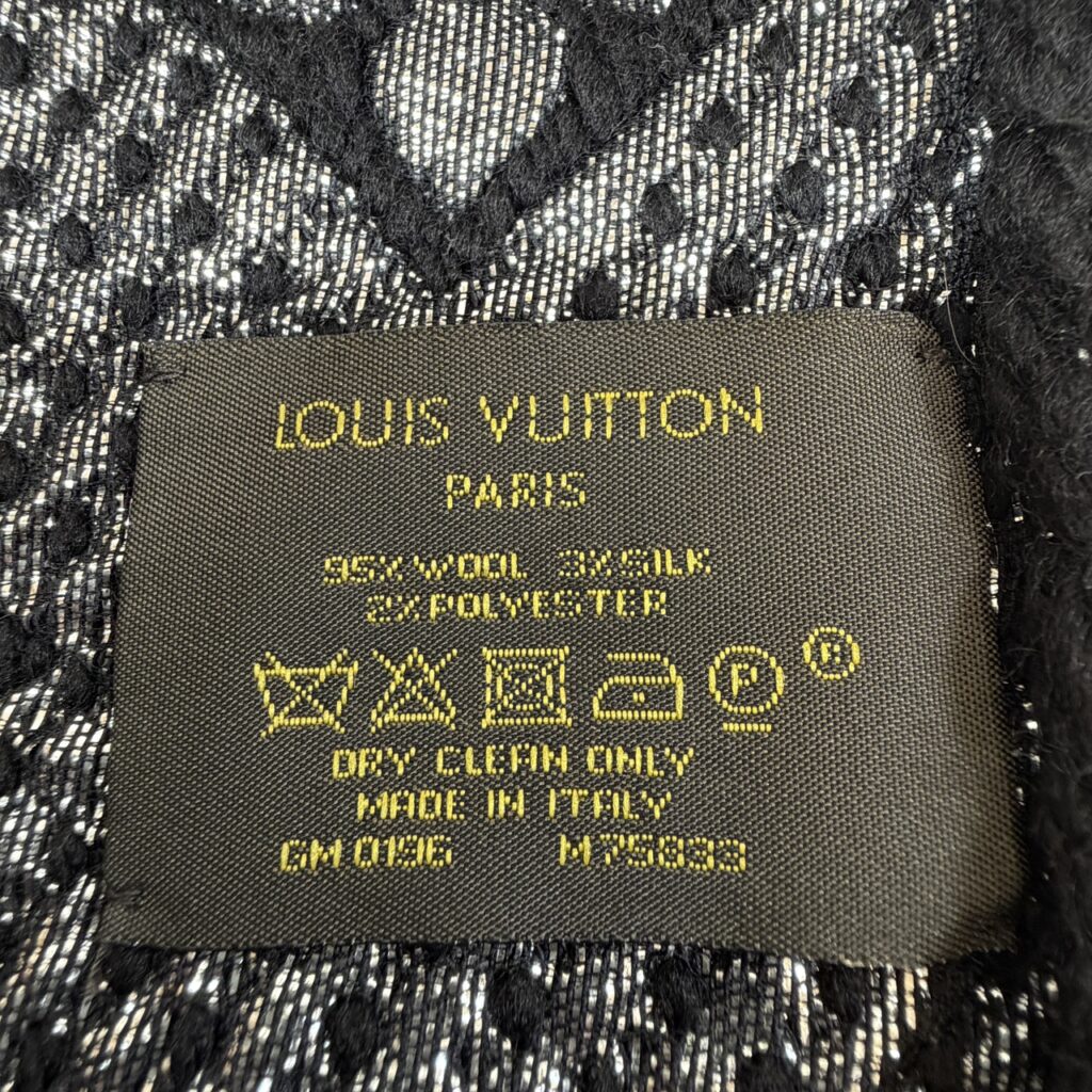 ルイ・ヴィトンのエシャルプ・ロゴマニア シャイン は、定番人気のロゴマニアシリーズのマフラーです。シックなブラックカラーに、光沢のあるシルバーのモノグラム・パターンが織り込まれているのが特徴です。