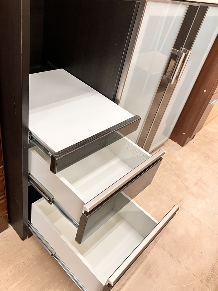 引き出しは奥までスムーズに引き出せるフルオープンレール仕様で、食器やカトラリー、食品ストックなどを効率よく収納できます。さらに、炊飯器や電気ケトルなどの家電を置けるスライド棚が付いているモデルもあり、機能性も抜群なんです🌟。シンプルで飽きのこないデザインは、どんなキッチンにも合わせやすく、まさに「お、ねだん以上。」の働きをしてくれる優れものです!