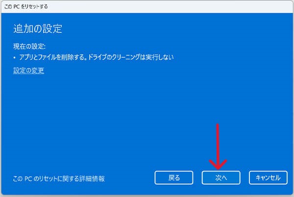 また、 「すべて削除する」を選択した場合のみ、最後の選択肢として「ドライブのクリーニング」が選択でき、ドライブのクリーニングを実行することで、保存されていたファイルなどの復元がされにくくなりますので買い替え、下取り、譲渡、廃棄などパソコン本体を手放される場合は「ドライブのクリーニング」の実行をおすすめします。