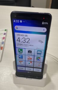 お持ち込みいただいたのは、auから発売されたシニア向けスマートフォン「BASIO4(ベイシオ フォー)」です。はじめてスマホを使う人や、シニア層に向けた使いやすさが特徴の機種です。