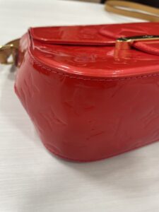 ヴェルニ特有のエナメルレザーには、全体的に小傷や擦れが見られましたが、ひび割れや大きな剥がれはありませんでした。ヴェルニは経年変化でべたつきが出やすい素材ですが、今回の商品は適切に保管されていたようで、べたつきもほとんど感じられませんでした。