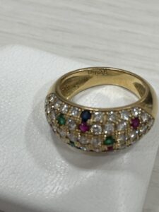 重量約8g、ダイヤモンド総カラット約0.5ct、ルビー、サファイア、エメラルド各0.1ct程度の豪華なリング。1990年代に購入されたもので、ほとんど使用していなかったため状態も良好。鑑別書もあり、高価買取となりました。