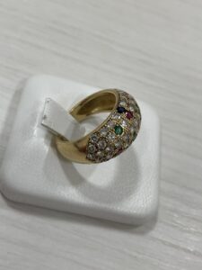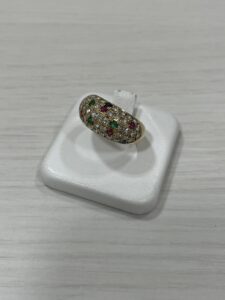 重量約8g、ダイヤモンド総カラット約0.5ct、ルビー、サファイア、エメラルド各0.1ct程度の豪華なリング。1990年代に購入されたもので、ほとんど使用していなかったため状態も良好。鑑別書もあり、高価買取となりました。