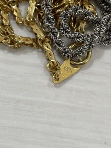 画像のように、金色のチェーンと銀色のチェーンが絡まった状態でも、貴金属であれば価値があります。デザインが古い、壊れている、変色しているといった状態でも、地金としての価値は変わりません。