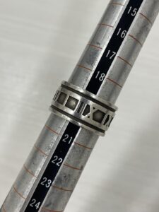 リングサイズを測定します。一般的なサイズ(10~15号程度)は需要が高く、特殊サイズは需要が限定的になることがあります。