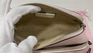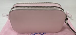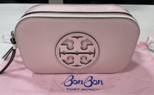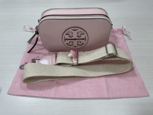 お持ち込みいただいたのは、アメリカの人気ブランド「トリーバーチ」と「BONBON」のコラボレーションショルダーバッグです。 ピンクベージュのカラーとロゴ刺繍ストラップが可愛らしいデザインです。