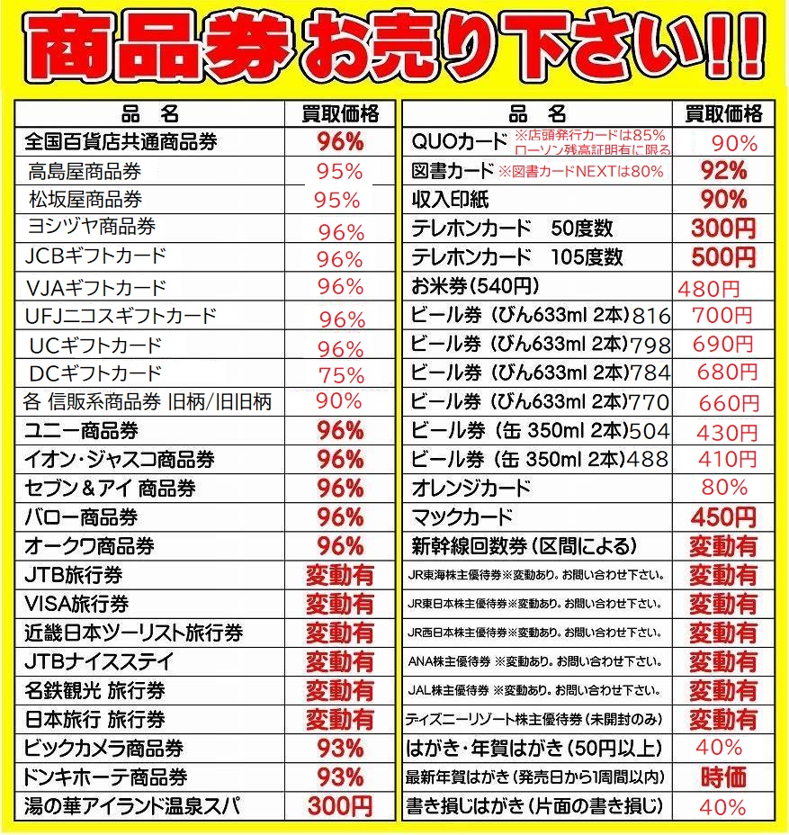 他にも、商品券・ギフトカード・旅行券・テレホンカード・ビール券・株主優待券などの買取をしております!