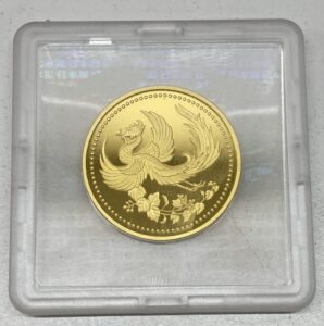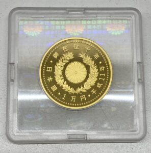 こちらは平成11年(1999年)に天皇陛下の御在位10周年を記念して発行された純金製の記念金貨です。今回お持ち込みいただいたものは専用ケースや付属品が揃っており、大切に保管されていた状態でした。