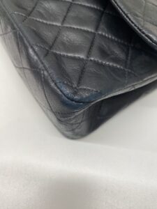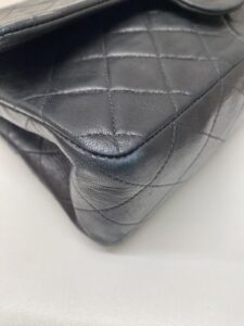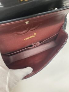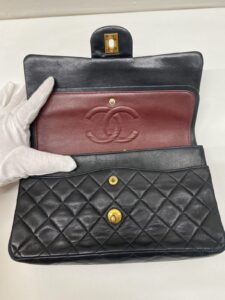 今回のバッグは「Wフラップ」タイプ。二重のフラップ構造により、セキュリティ性が高く、バッグ内部も美しく保てる点が特徴です。Wフラップは、見た目のデザイン性だけでなく、シャネルの伝統を象徴するディテールでもあり、ヴィンテージ市場でも特に評価されるポイントです。