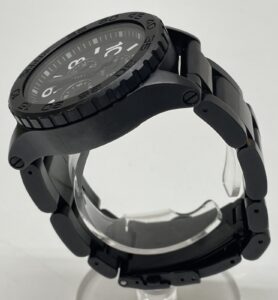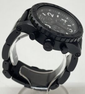 ブラックのケースとバンド、そしてクロノグラフ機能が特徴的なデザインです。