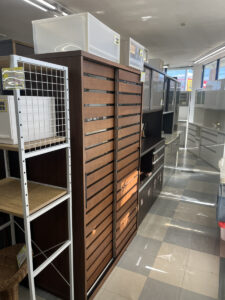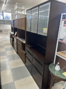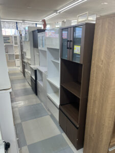 家具の仕入れが多く入りましたので家具コーナーの変更を行いました。食器棚が5台新しく入荷しています。食器棚、ソファの在庫に関しては地域NO.1の在庫数を目指しています。