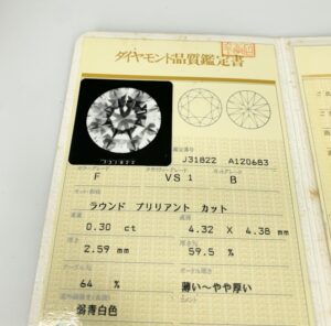 鑑定書には①にて説明した4Cが記載されておりますので鑑定ではどうしても確認のできない裏側や、地金との接着面なども含めての評価が記載されています。