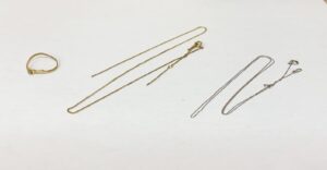 本日ご紹介するのは「K18 リング(0.85g)・K18 チェーン×2(1.49g)(0.73g)」3点です。ちぎれたチェーンでも金の重さでお買取できます。