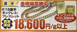 リサイクルマート高知介良店では、18金の喜平ネックレスや指輪、18金のメガネフレームなど、片方のみのイヤリング、キャッチがなくなったピアス、キャッチのみ、チェーンがちぎれしまったネックレスや、石が取れてしまったリングなど、どんな状態でもお買取りしております。