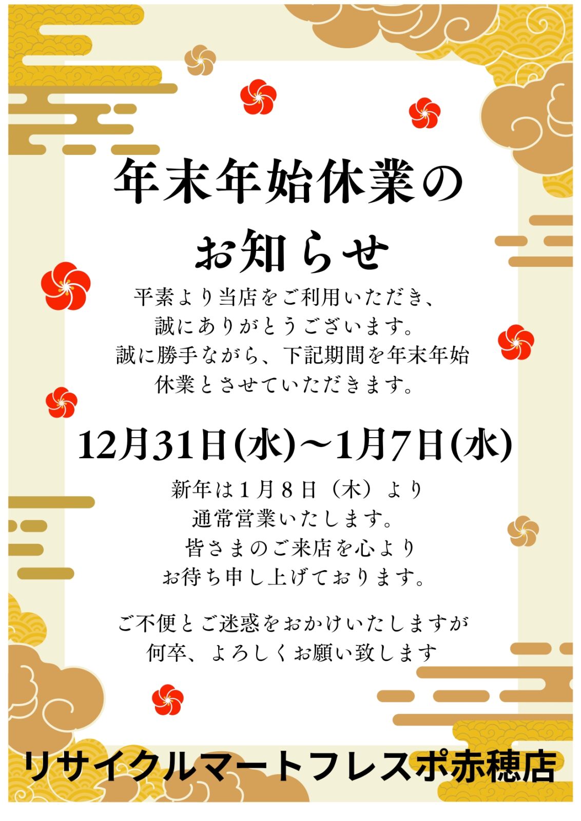 年末年始営業のお知らせ 平素より買取専門リサイクルマート フレスポ赤穂店 をご利用いただき、誠にあり… <a href="https://www.recyclemart.jp/shop/akou/info/1092300/" class="read-more">Read More</a>