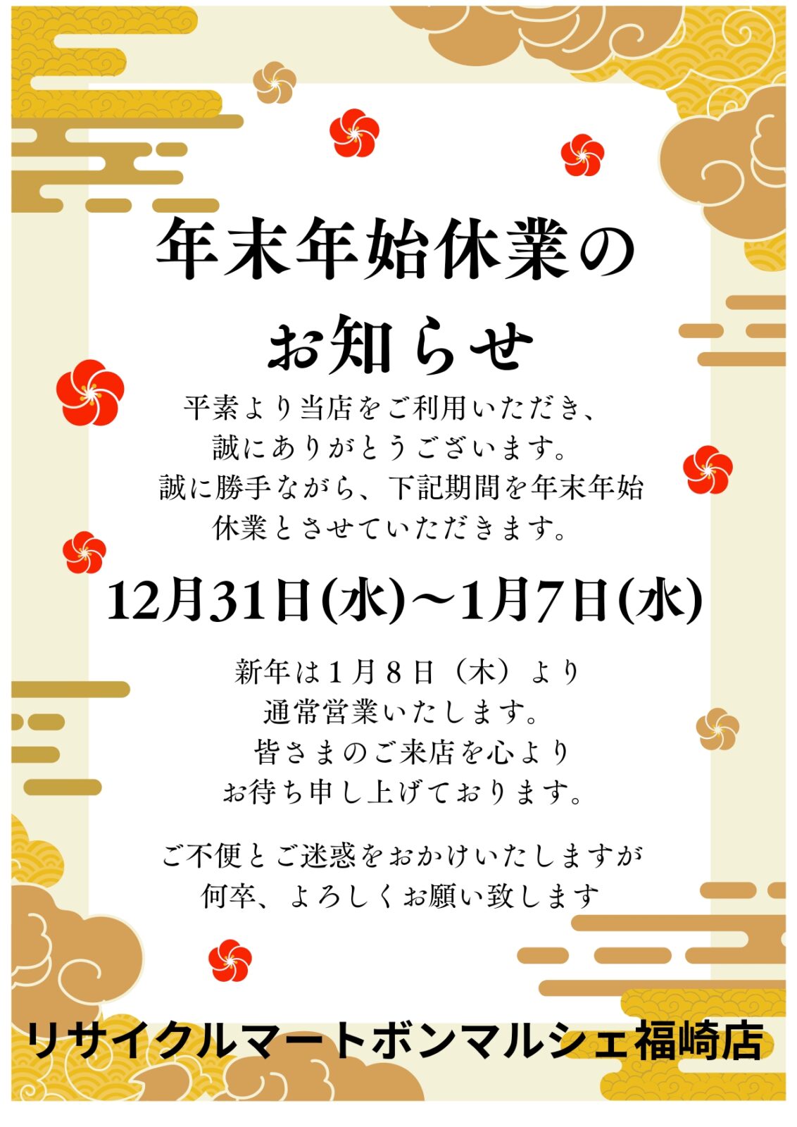 年末年始営業のお知らせ 平素よりリサイクルマート ボンマルシェ福崎店 をご利用いただき、誠にありがと… <a href="https://www.recyclemart.jp/shop/fukusaki/info/1092296/" class="read-more">Read More</a>