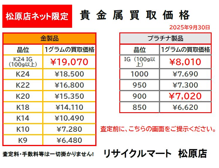 9月30日 史上最高値更新!本日の貴金属 買取価格 リサイクマート松原店