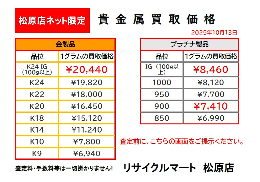 10月14日 爆上がり!本日の貴金属 買取価格 リサイクルマート松原店
