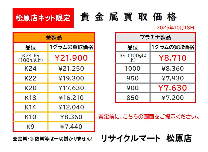 10月18日 本日の貴金属 買取価格 リサイクルマート松原店