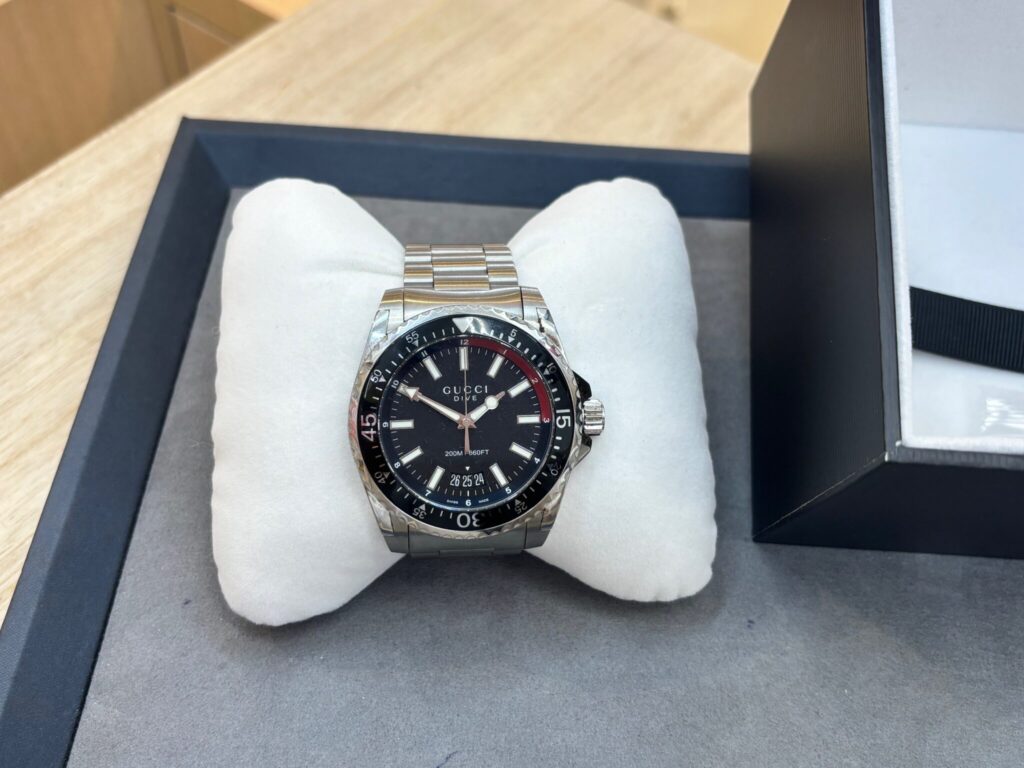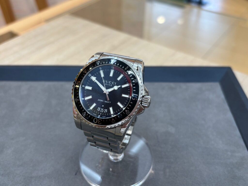 グッチの「DIVE」シリーズは、ファッションブランドの枠を超えた本格仕様。 この136.2モデルも、200m防水を誇り、スキューバダイビングにも耐えられるレベルの防水性能を備えています。 見た目だけじゃなく、機能も本物なんです。