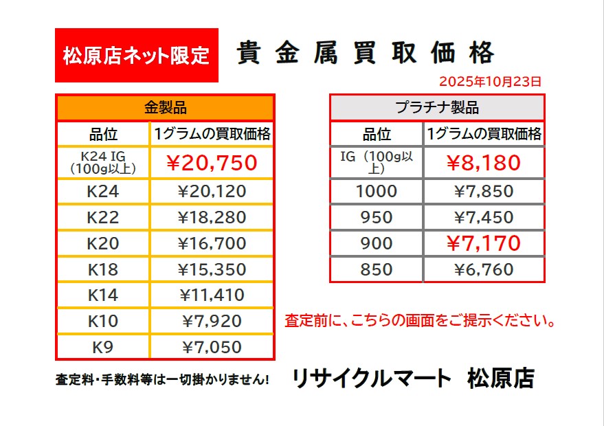 10月23日 高騰!本日の貴金属 買取価格 リサイクルマート松原店