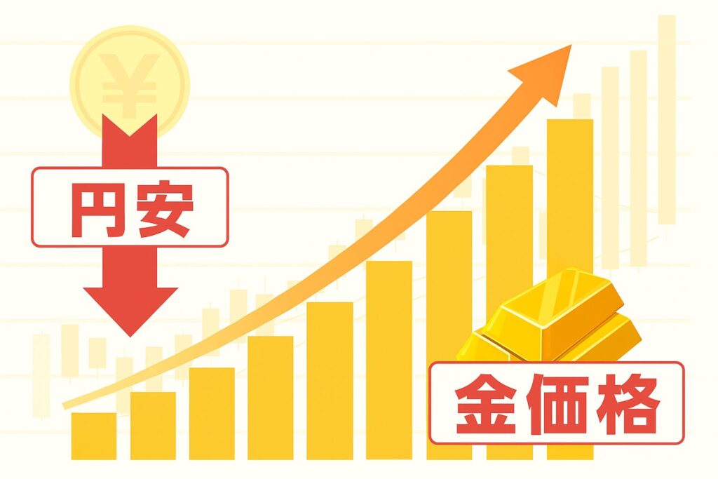 金は国際的には米ドル建てで取引されており、日本国内の金価格は「ドル建て金価格 × 為替レート」によって決まります。つまり、円安が進行すると、たとえドル建ての金価格が横ばいでも、円換算では金価格が上昇するのです。