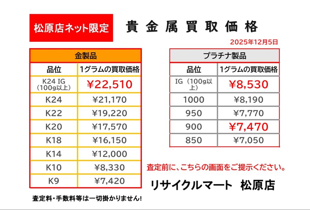 12月5日 本日の貴金属 買取価格は?リサイクルマート松原店