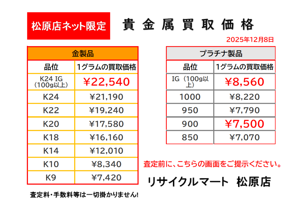 12月8日 本日の貴金属 買取価格は?リサイクルマート松原店