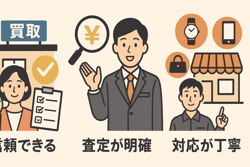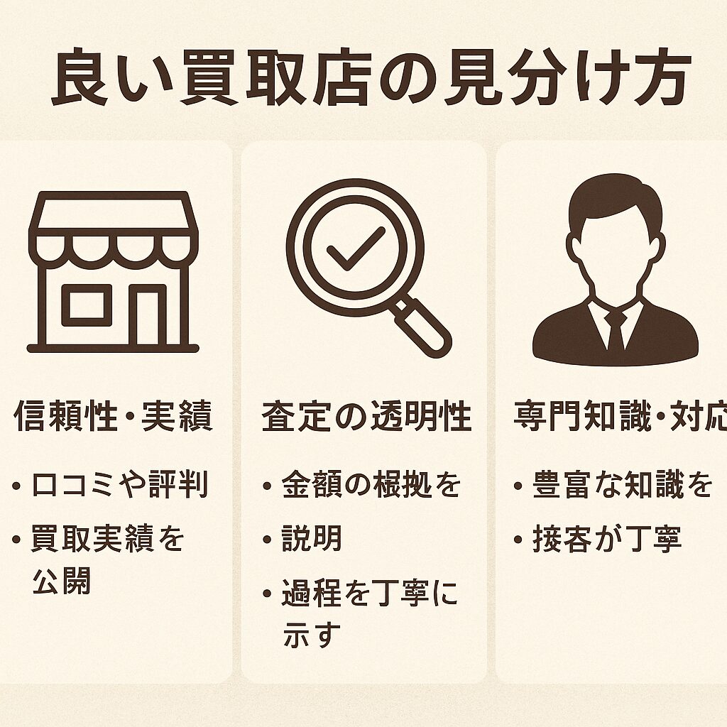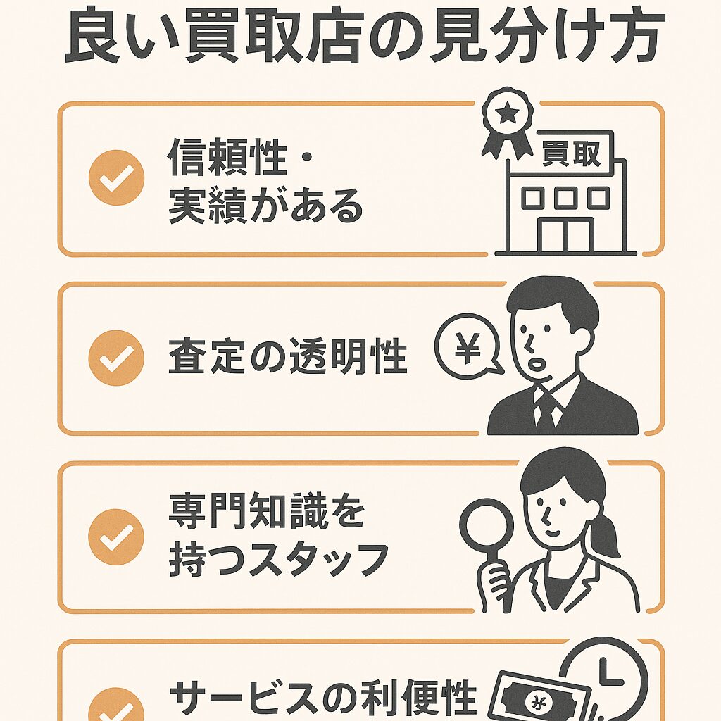 良い買取店を見分けるポイントは、 「信頼性」「査定の透明性」「専門知識」「サービスの利便性」「顧客対応の丁寧さ」です。