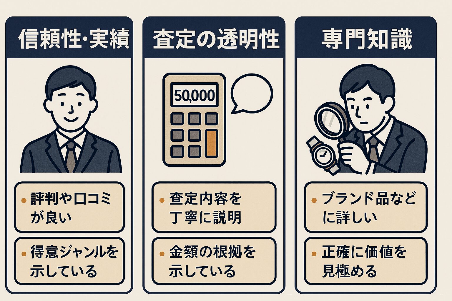 良い買取店を見分けるポイントは、 「信頼性」「査定の透明性」「専門知識」「サービスの利便性」「顧客対応の丁寧さ」です。