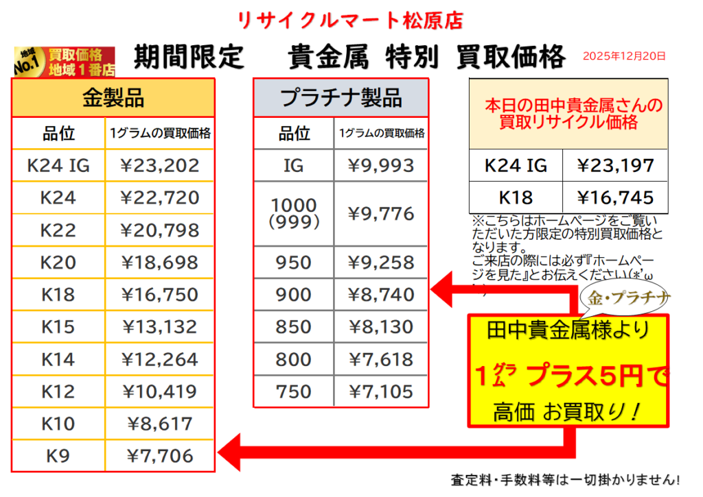 貴金属 高価買取!田中貴金属より高く買います!リサイクルマート松原店