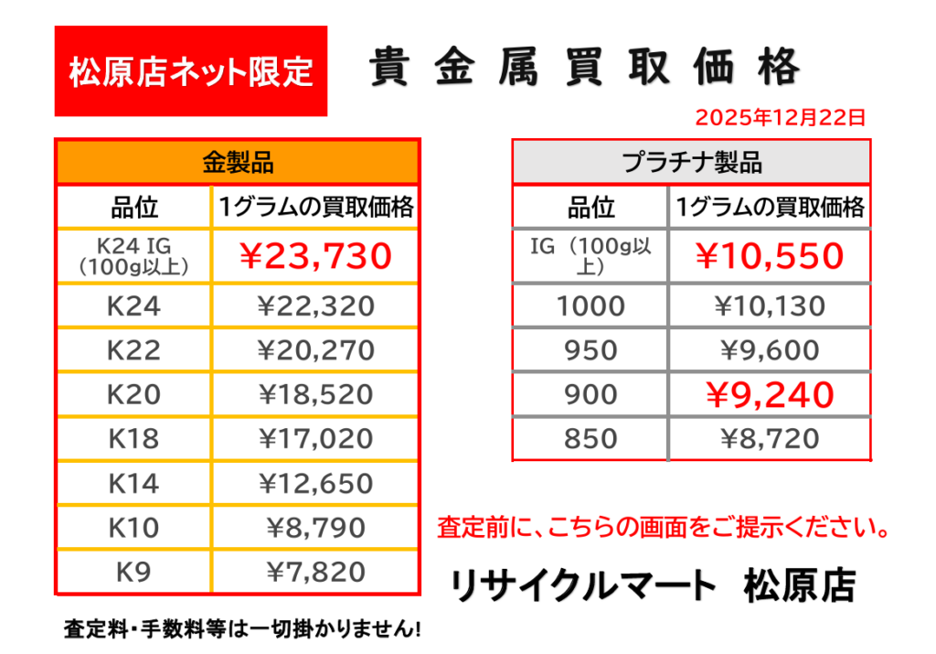 2025年12月22日 本日の貴金属 買取価格は?リサイクルマート松原店