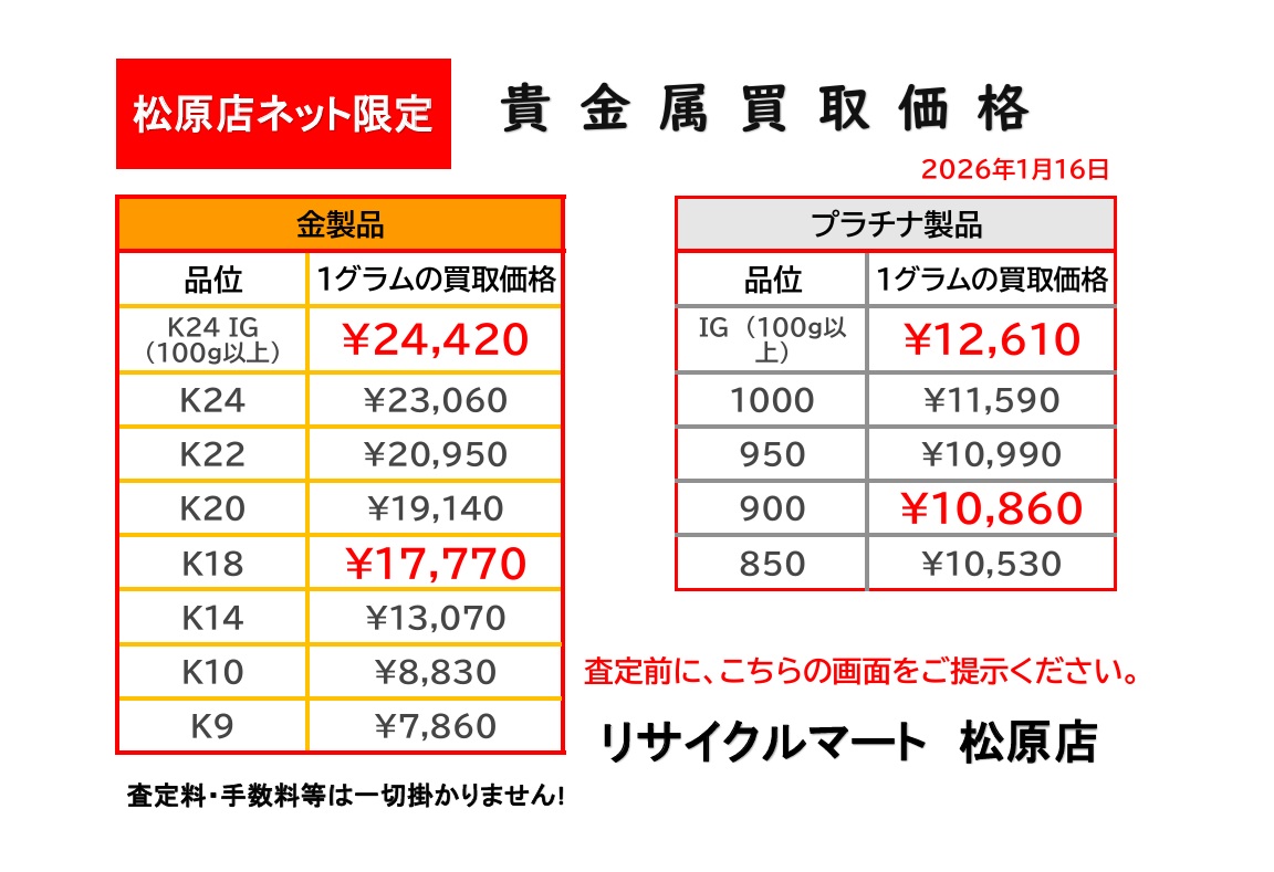 2026年1月16日 本日の金・プラチナの 買取価格は?リサイクルマート松原店