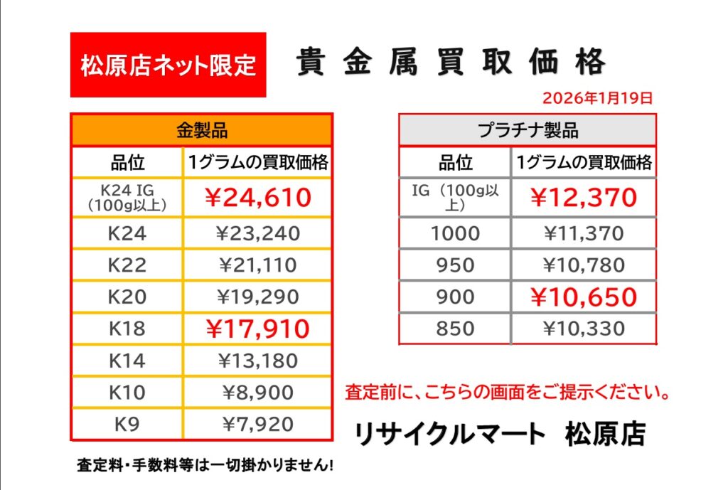 2026年1月19日 本日の金・プラチナの 買取価格は?リサイクルマート松原店