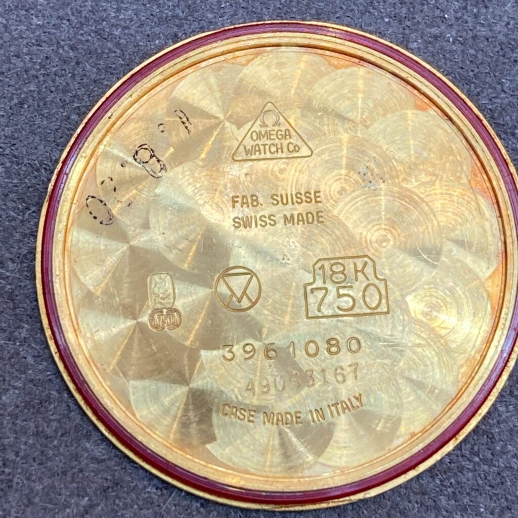 裏蓋の内側(IMG_E1075.JPG)には、「18K」「750」という刻印がはっきりと刻まれています。これは製品の75%に純金が使用されている「金無垢」であることを証明する世界共通の証です。さらに、デザインの本場イタリアで作られたことを示す「CASE MADE IN ITALY」の刻印や、オメガ独自のホールマークも確認できます。