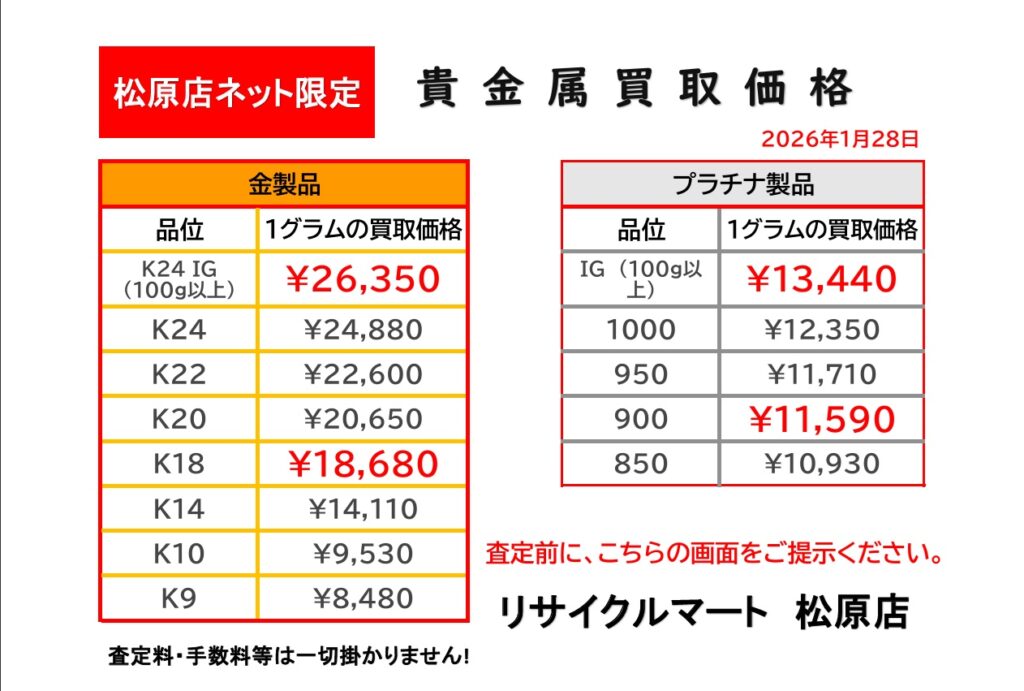 2026年1月28日 本日の金・プラチナの 買取価格は?リサイクルマート松原店