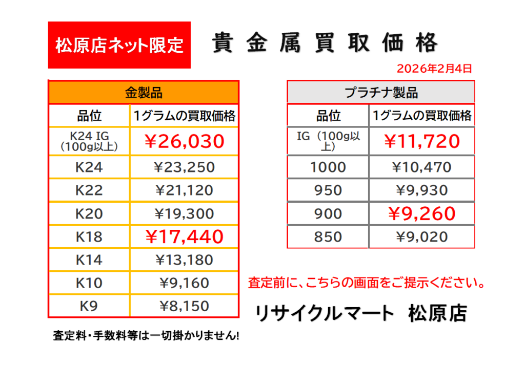松原市の「リサイクルマート松原店」でも、 「金・プラチナって今売り時?」 「昔買った指輪、今いくらになる?」 といったご相談が増えています。